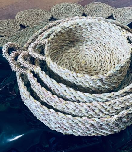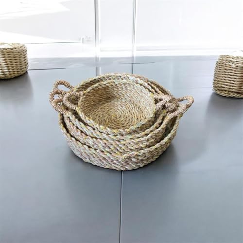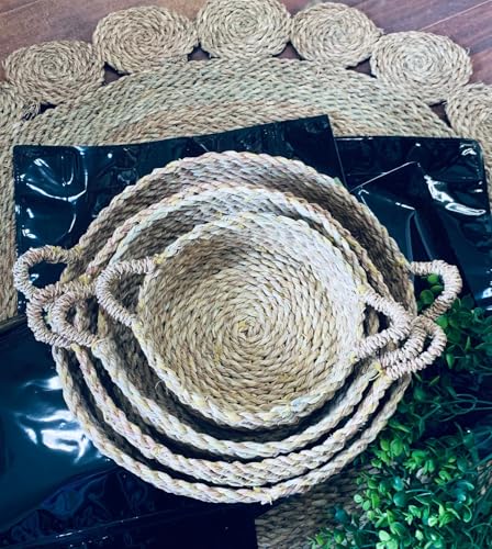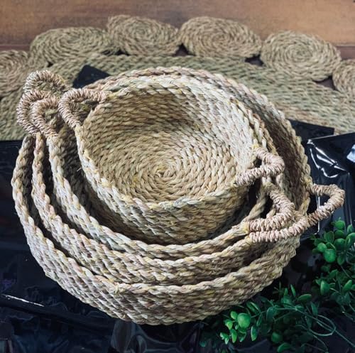 Generic - طقم سلال تقديم دائرية من الخوص الطبيعي بمقابض – 4 قطع بأحجام مختلفة – سلال يدوية للتقديم والتخزين والديكور