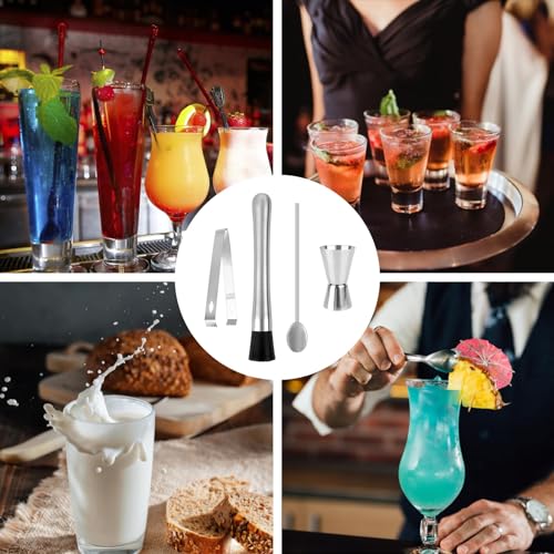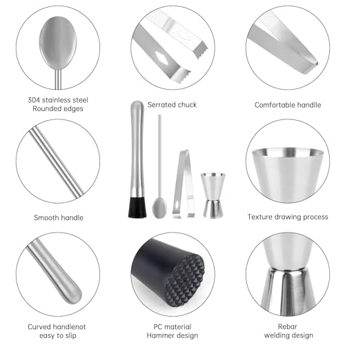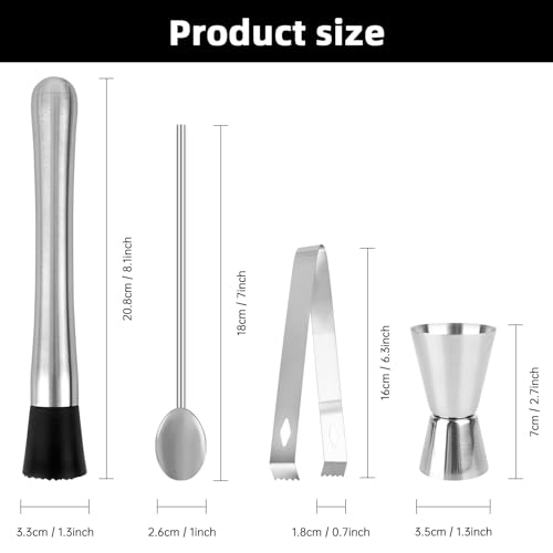 - 🍹High-Quality Material: Crafted from 304 stainless steel, our cocktail set is durable, robust, and resistant to bending, breaking, or wear and tear. Unlike plastic alternatives, this stainless steel base can easily crush ingredients like mint, lime, and ice cubes, making it ideal for both professional bartenders and cocktail enthusiasts.
