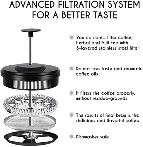 - 【مكبس قهوة فرنسي】تعد أفضل ماكينة صغيرة لتحضير فنجان القهوة الصباحي الخاص بك بفضل سهولة التحضير والتصفية المثالية والتنظيف السريع والتصميم الأنيق، كل هذه المزايا تجتمع لتوفر لك كل ما تريده في مكبس تحضير القهوة الفرنسي، مثالي لصنع القهوة الطازجة أو الشاي أو الاسبريسو أو القهوة الباردة