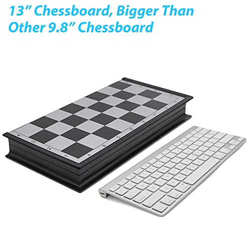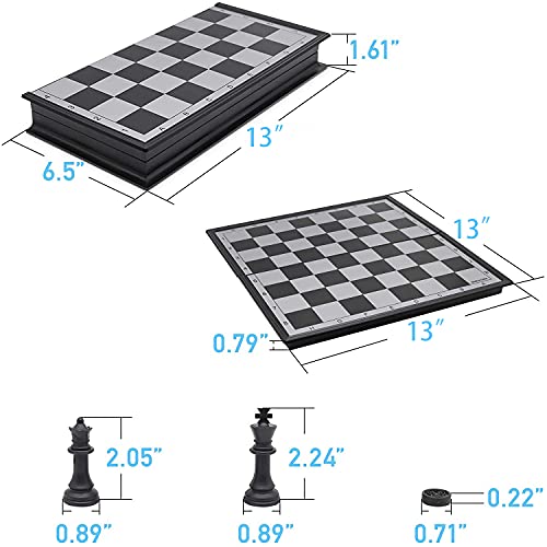 - [Dimension] The opening size of the chessboard is 13*13*0.79 inches, bigger than 9.8" chessboard, while the folded size is 13*6.5*1.61 inches. The height of the king's pieces is 2.24 inches, the queen is 2.05 inches, the diameter of a backgammon/checkers piece is 0.71 inches.