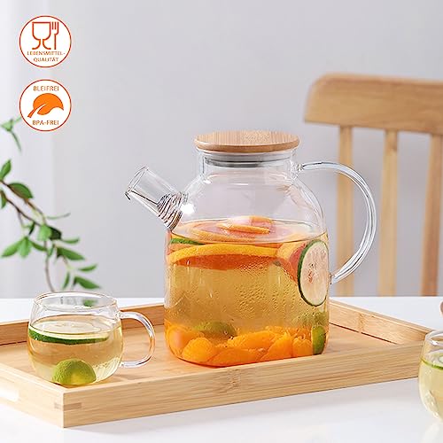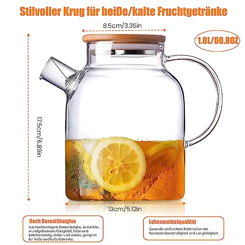 NEEMOSI - Glass Teapot with Strainer Insert, 1.8L, Transparent, High Borosilicate, Wood & Stainless Steel Lid