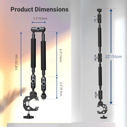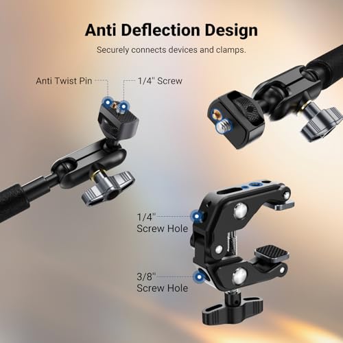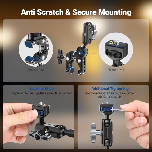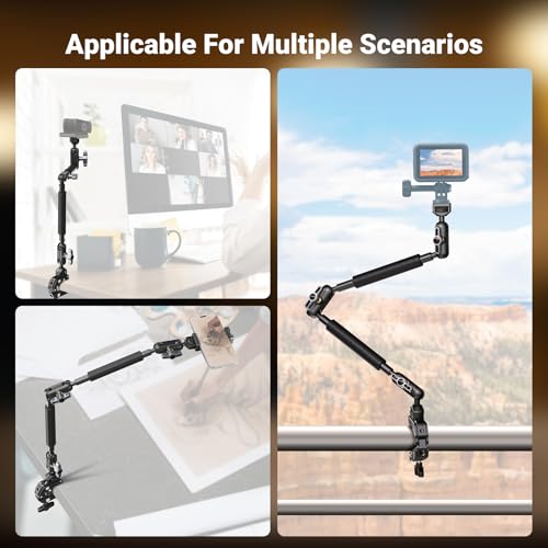 - 【ذراع سحري مع مشبك فائق】 مصنوع من خليط معدني من الألومنيوم المتين، يقبل ذراع الكاميرا السحري الكاميرات غير العاكسة أو كاميرات الحركة أو كاميرات الويب أو الهواتف الذكية التي يصل وزنها إلى 500 غرام، ضعف الموديلات المنافسة، مع حامل هاتف متقدم، إنه حل تثبيت متعدد الاستخدامات للتصوير لأسفل ومدونات الفيديو والبث المباشر ومؤتمرات الفيديو وغيرها من الصور ومقاطع الفيديو. يوصى به في الحالات الثابتة