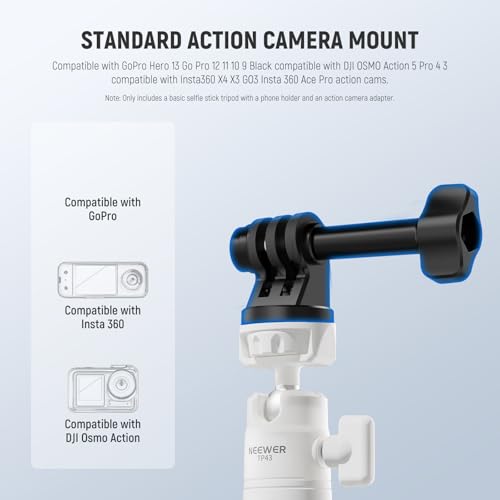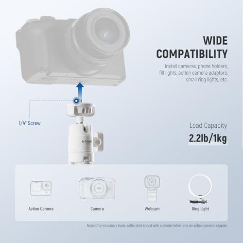 NEEWER - حامل ثلاثي صغير للمكتب وعصا سيلفي TP43 برأس كروي 360° ومحور مركزي مرتفع من المعدن محمول متوافق مع ايفون وجو برو وإنستا 360 ودي جي آي من نيوير، لون أبيض