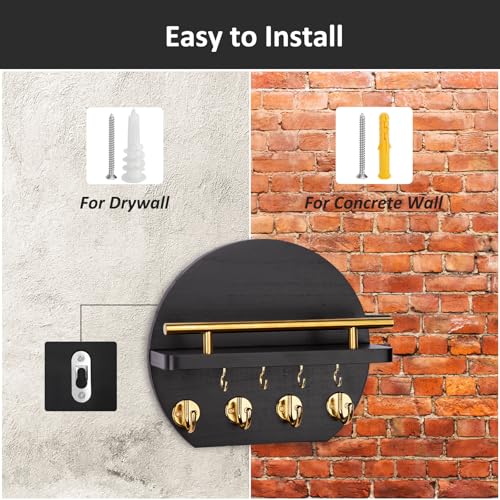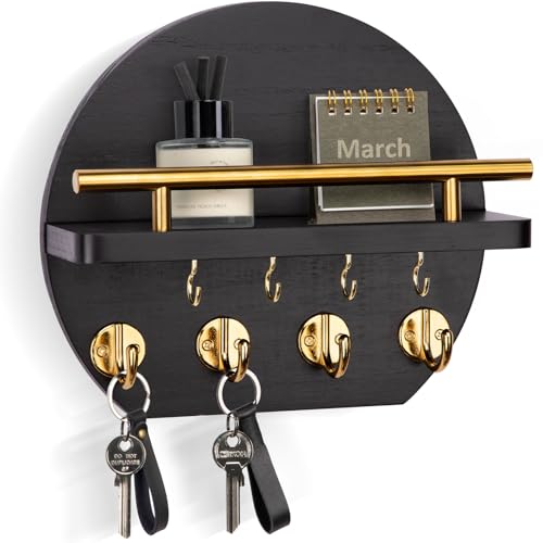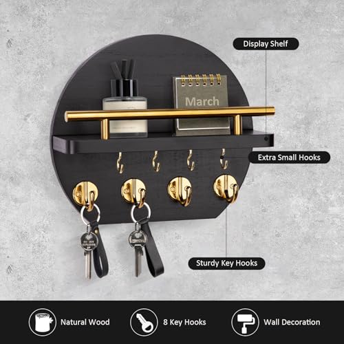 Nekon - Nekon Key Holder for Wall - 9.8 Inch Apartment Wall Decor with Shelf and 8 Key Hooks, Circular Wood Key Hanger for Home Decor (Black with Golden Hooks)