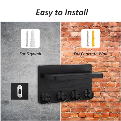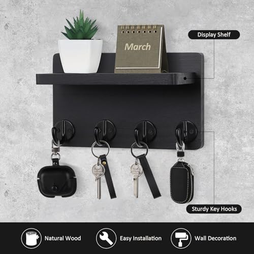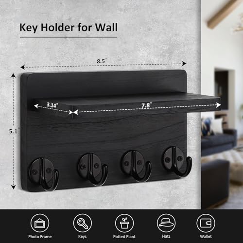 Nekon - Nekon Key Holder Wall Mount, 8.5 Inch Small Home Decor Wooden Wall Organizer with 4 Hooks and Shelf, Wall Decor for Living Room Entryway Kitchen (Black)