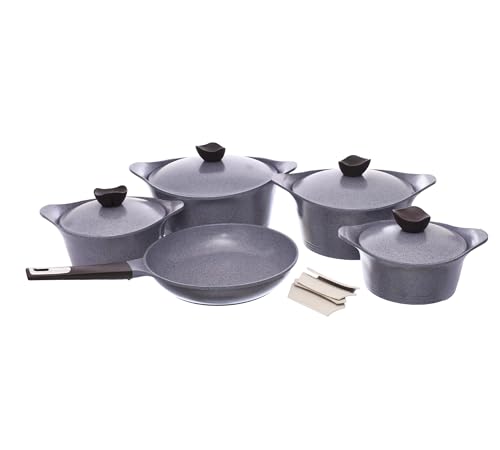 - NESTING COOKWARE SET: The Granite 11 Pc nesting nonstick cookware set is designed to provide everything needed in a kitchen to cook like a pro without taking up the same amount of storage space .