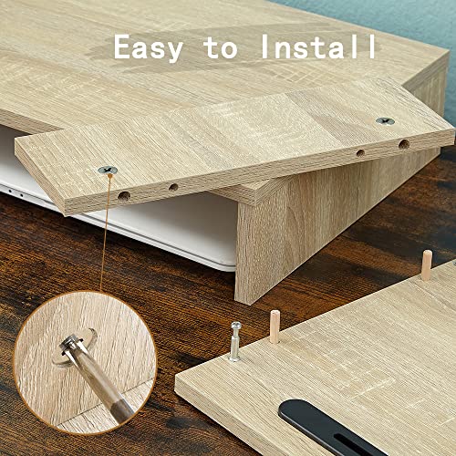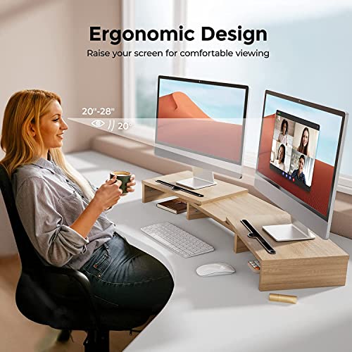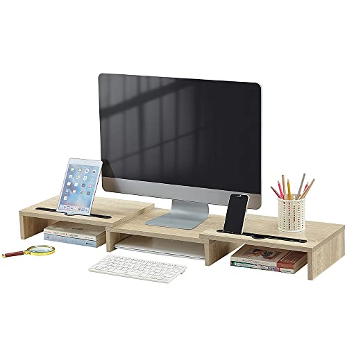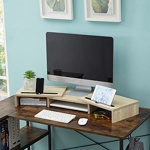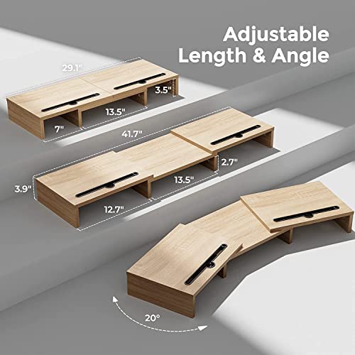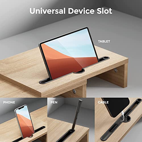NeoStyle - NeoStyle Monitor Stand Riser with 2 Slots for Phone & Tablet, Length and Angle Adjustable 3 Shelf,Multifunctional Desktop Organizer for Monitor, Laptop, Tablet (Light Wood)