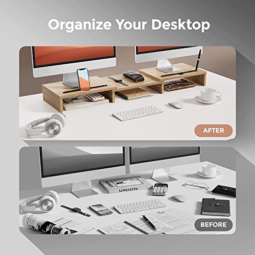 - 💝【Desk Organization & Big Storage Space】This dual monitor stand lifts your monitors and creates three storage space underneath to organize your office supplies and accessories like keyboard, mouse, stapler, sticky notes, office files, notebook, calculator etc. Makes your desk clean & neat!