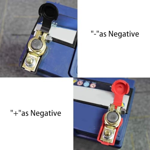 - Made of high quality material, with nut and black plastic cap and nuts, + - is marked directly on the end. Suitable for 6V/12V