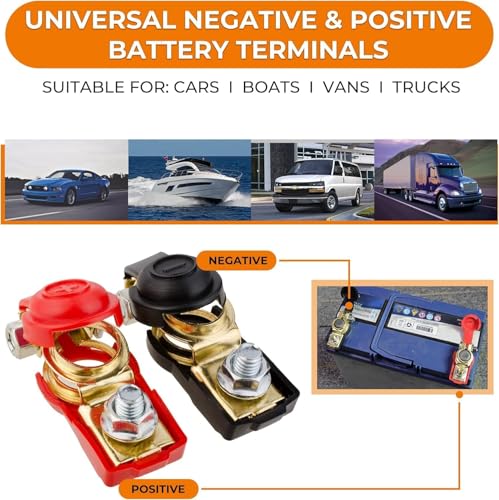 - 1 pair of standard top shaft positive and negative connectors to increase strength and reduce corrosion. High quality conductivity replacement for superior strength and corrosion resistance. Battery cable tip with good delivery performance and corrosion resistance, can reduce voltage deformation and transport loss. Convenient wire installation process and strong connection