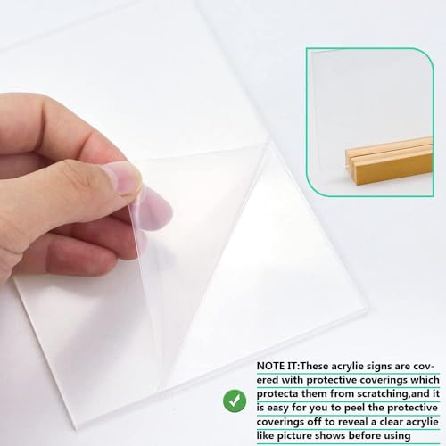 - Acrylic sign: These clear acrylic signs are made by professional laser cutting,no jagged or rough,prevent users from scratches,which is convenient for you to use any water or oil based paint pen to write on it and easy for you to wipe them gently with acetone if you want to use them again and again.NOTE IT: These acrylic signs are covered with protective coverings which protects them from scratching,which is easy for you to peel the protective coverings off to reveal a clear acrylic before using