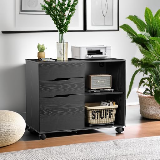 NEWBULIG - دولاب خشب متحرك بـ3 أدراج، لتخزين الملفات بالجانب وحامل طابعة مع رفوف تخزين مفتوحة قابلة للتعديل وعجلات للمنزل والمكتب من نيوبوليج، أسود