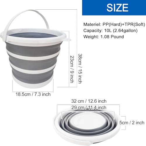 - 【Save space】The 10-liter (2.6 gallon) folding bucket measures 9 inches in height, 12.6 inches in diameter, and can be instantly folded to a height of 2 inches.This is a 70% reduction in space.