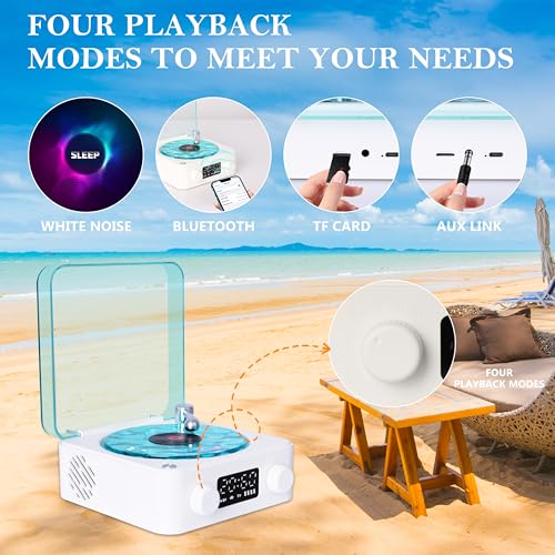 - 【Vintage Vinyl Record Player】White noise mode , Bluetooth mode, TF card mode, and AUX mode. You can choose different modes according to your needs to meet your needs in various atmospheres.Press and hold the light button for 3 seconds, then the time indicator light flashes, rotate the volume button to adjust the time!