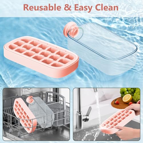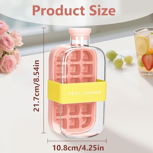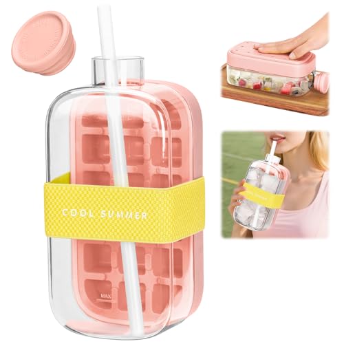 Nexhyp - Ice Cube Bottle 800ml with Straw, 2-in-1 Push-Type Ice Making Bottle with Reusable Lid & Bin, Portable Water Bottle Ice Cube Tray for Home, Outdoor, Office, Summer Beverages (Pink)