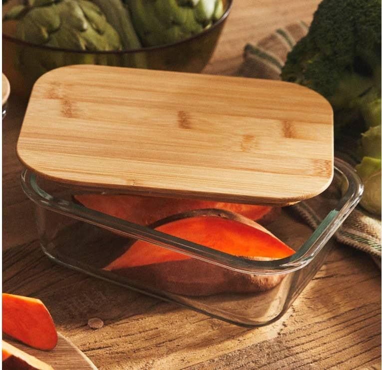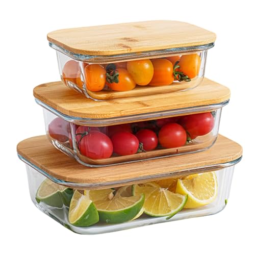 - 3-piece Thermal Glass Casserole Set with sealed bamboo wood cover, ideal for oven, microwave, freezer, and dishwasher hassle free.