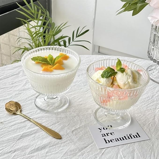 - تصميم كلاسيكي مخطط (Ribbed Design): تتميز الكاسات بنقوش خطوط عمودية بارزة تمنحها طابعاً كلاسيكياً (Vintage) راقياً، وتساعد في كسر الضوء لإبراز جمال ألوان الآيسكريم وطبقات الحلوى بداخلها بشكل مغرٍ وجذاب.