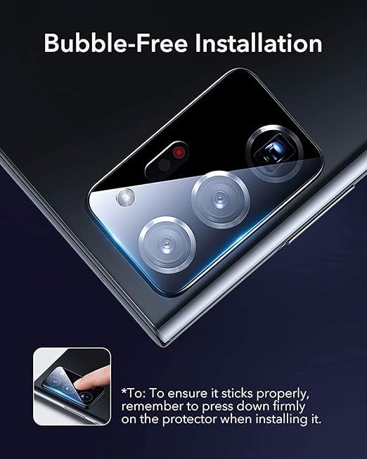- [تركيب سهل وخالٍ من الفقاعات:] يتميز الواقي بتقنية لاصقة ذكية تجعل عملية التركيب بسيطة وسريعة، بدون ظهور فقاعات هواء أو غبار، مما يضمن تثبيتًا متينًا ومتناسقًا يحمي العدسة بأعلى كفاءة.