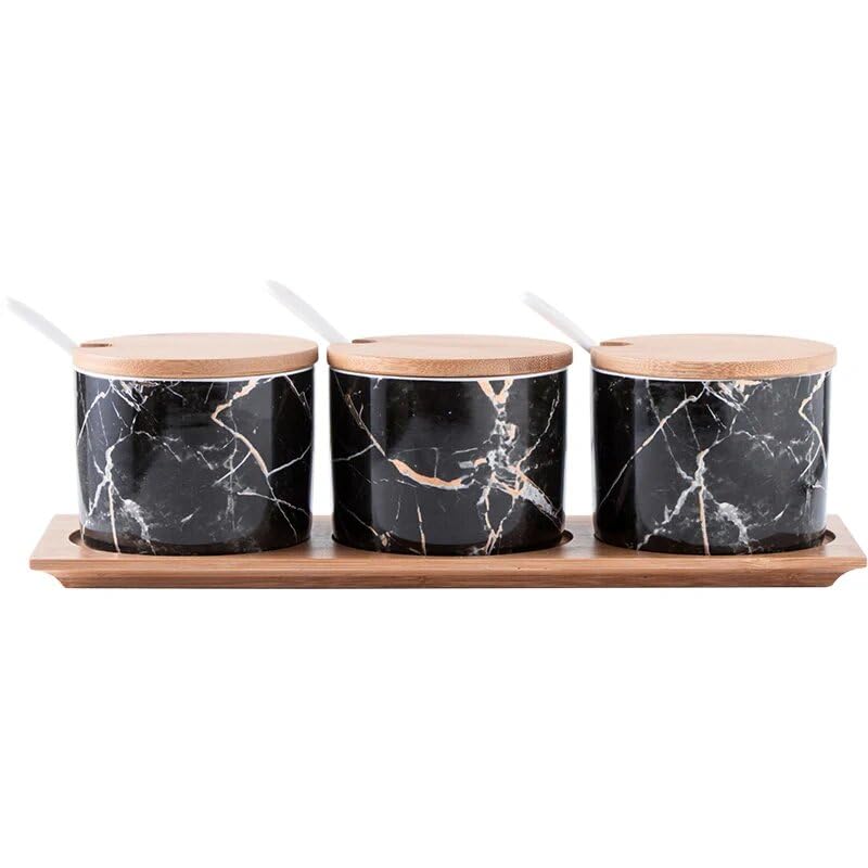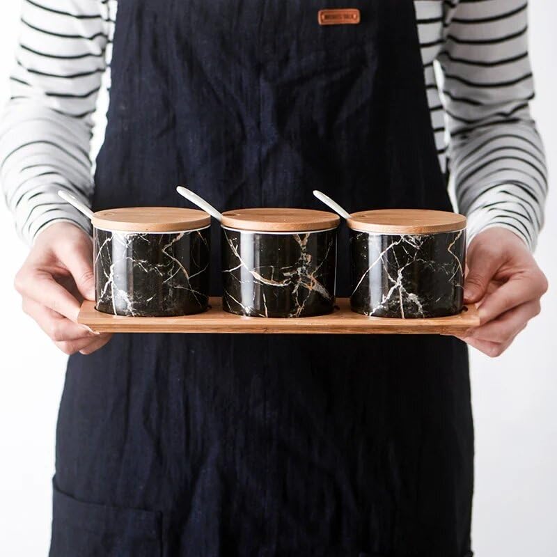 Next store - Next Store Elegant 3 Piece Spice Set Made of Premium Porcelain with Wooden Lids and Practical Display Tray, Modern Design Preserves Flavor and Adds a Sophisticated Touch