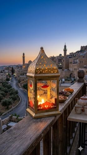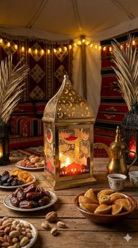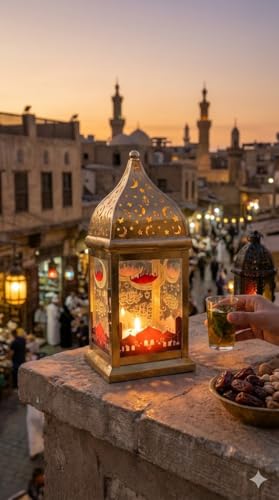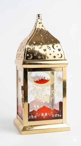 - Artistic glass paintings: the lantern features beautiful delicate print glass faces featuring mosques shades and red domes, topped with lanterns and gold hanging ornaments, creating a complete amadan view.