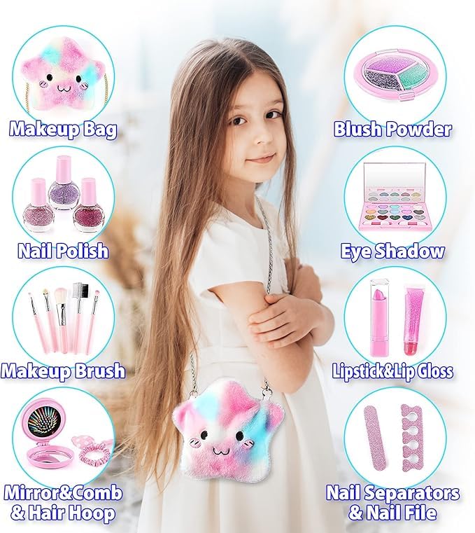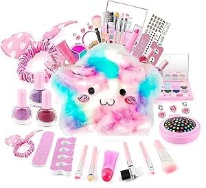 Next store - مجموعة مكياج أطفال للبنات من Next Store، لعبة تجميل آمنة وقابلة للغسل، مع حقيبة فرو لطيفة على شكل نجمة، تشمل أدوات تجميل وأظافر متنوعة. هدية مثالية للعب التظاهري فوق 3 سنوات.