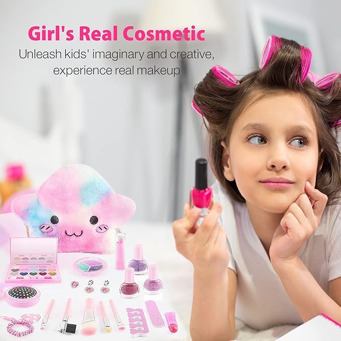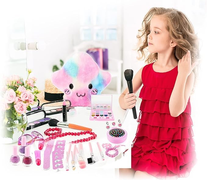 - [مجموعة متكاملة من أدوات التجميل] : تحتوي المجموعة على مستحضرات تجميل متنوعة تشمل ألوان الشفاه، ظلال العيون، طلاء الأظافر، فرش المكياج، وغيرها من الإكسسوارات المخصصة للأطفال، لتجربة لعب تفاعلية تجمع بين الإبداع والمتعة في تقمص أدوار التجميل.