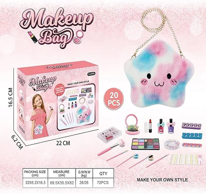 - [حقيبة أنيقة على شكل نجمة لطيفة] : تأتي مجموعة التجميل داخل حقيبة فرو ناعمة على شكل نجمة جميلة، تمنح الأطفال شعوراً بالتميز والفرح أثناء حمل أدوات التجميل والتنقل بها، مما يجعلها مناسبة للعب في المنزل أو أثناء الخروج والرحلات مع الأصدقاء.