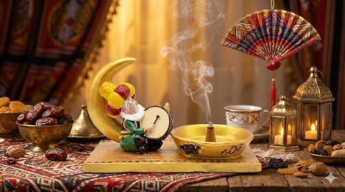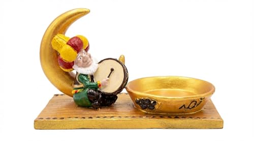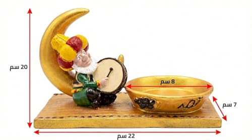 - ألوان احتفالية زاهية: التباين الجميل بين اللون الذهبي للوعاء والهلال، وبين ألوان ملابس المسحراتي (الأخضر والأحمر)، يجعلها قطعة ديكور نابضة بالحياة تفتح الشهية وتسر الناظرين.