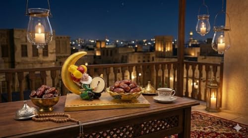 - شخصية "المسحراتي" المحبوبة: يتميز التصميم بوجود مجسم ملون ومتقن لشخصية المسحراتي وهو يضرب على طبلته، مما يضيف لمسة من البهجة والذكريات الرمضانية الجميلة لضيافتك.