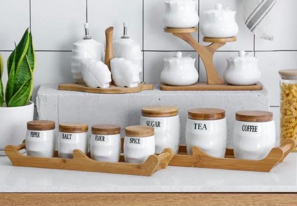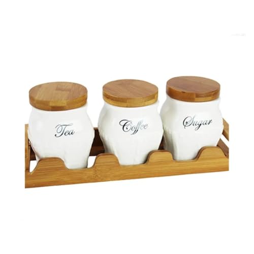 Next store - Next Store Porcelain Seasoning Set with Airtight Wooden Lid with Silicone Gasket and Elegant Wooden Base for Storing Tea, Sugar and Coffee with 3 Practical Pieces (Wooden)
