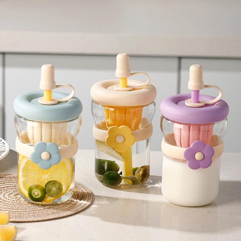 Next store - Next store Pyrex Flower Shape Mug with Fruit Infuser + Straw and Silicone Strap - Practical and Stylish Cup for Preparing Drinks and Fruits (Beige)