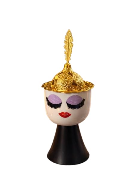 - قاعدة معدنية للثبات: ترتكز المبخرة على حامل معدني قوي بتصميم أرجل أنيق، مما يرفع وعاء البورسلين عن الأسطح لحماية الطاولات والمفارش من الحرارة المباشرة، ويمنحها ثباتاً ممتازاً وتوازناً مثالياً.