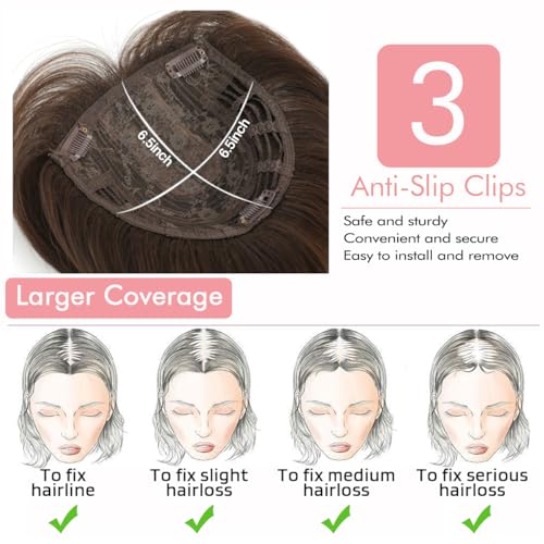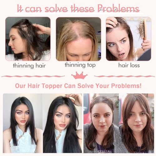 - 【More Volume】 Unlike thinning human hair topper, our hair topper is cheaper and more volume. The hair topper base size is larger than others, so it has more room to conceal your hair problems naturally. It is not suitable for someone with nearly bald top cause the clips may not stay in well.