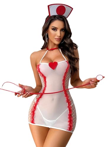 Generic - NF22-439 طقم لانجري تنكري ممرضة، أبيض وأحمر، تصميم شبكي منقط، مع دانتيل وغطاء رأس، قصة قصيرة مثيرة