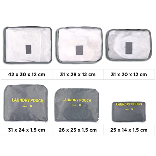 - 6 ITEMS CONTAINED : 1 Packing Cubes: Dimensions : Bags : 40x11.5x30xcm ; 31x11x28cm ; 30.5x11.5x20cm / Dimensions : Pouches : 31x23cm ; 26.5x22.5cm ; 25x14cm