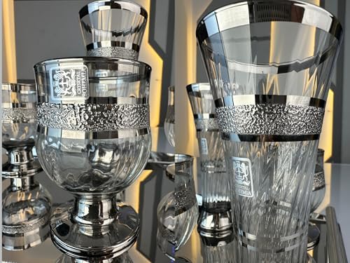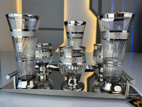 - طقم فاخر من الأكواب الزجاجية: يتضمن 12 قطعة من الأكواب الزجاجية الأنيقة المزينة بحافة فضية لامعة وزخارف معدنية منقوشة تضفي لمسة من الفخامة والرقي على طاولتك