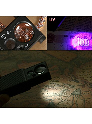 - Multi-functional magnifier with 3 in 1 Design: 30X and 60X power magnifiers, UV currency detector.