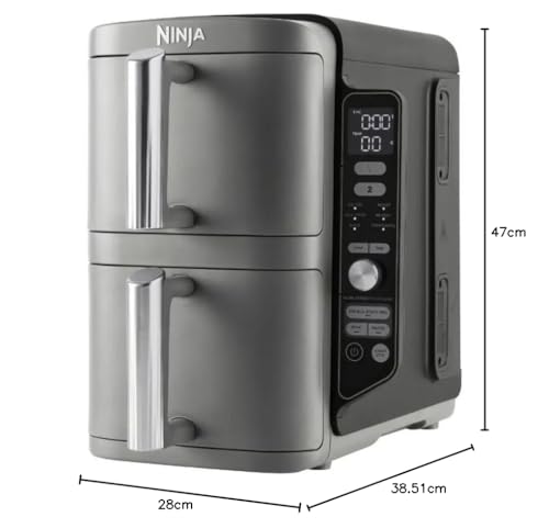 - Includes: Ninja Double Stack 9.5L Air Fryer, 2 x 4.75L Drawers, 2 x Non-Stick Plates and 2 x Shelves Dishwasher safe. Dimensions: Height 38.5cm x Width 28cm x Depth 47cm Weight: 10.3kg Colour: grey