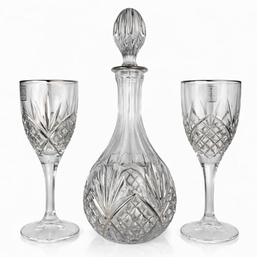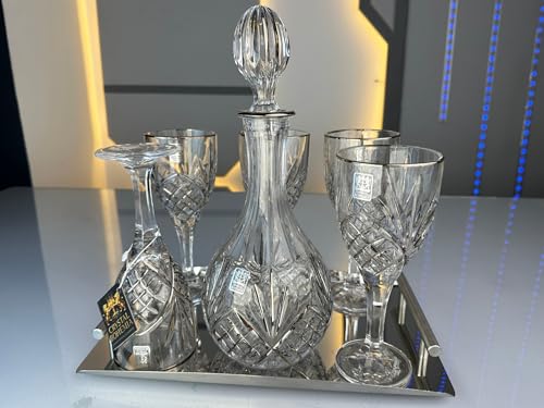 - طقم كريستال فاخر: يتضمن قارورة أنيقة مع 6 كاسات نيش بتصميم كلاسيكي منقوش بنمط الأناناس مع حواف فضية لامعة تضيف لمسة من الفخامة