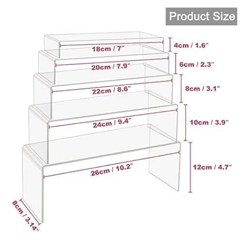 - √【5 Sizes】-The acrylic display shelves come in 5 different size to meet your various display need(Length x Width x Height): 18x8x4cm, 20x8x6cm, 22x8x8cm, 24x8x10cm, 26x8x12cm.