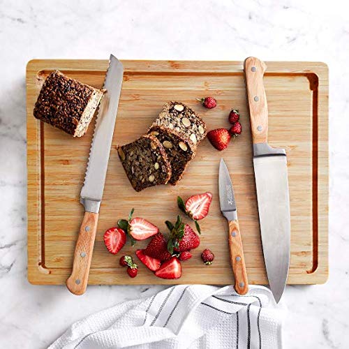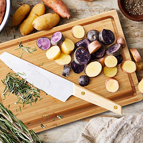 - [تصميم فريد] يحتوي لوح التقطيع على مساحات تخزين مدمجة لوضع الثوم المهروس والخضروات المقطعة والجبن مؤقتًا. وهناك أخاديد عصير حول لوح المطبخ لتجنب تدفق مياه العصير. حافظ على نظافة المطبخ.