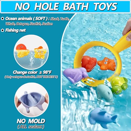 - COST-EFFECTIVE ITEMS: QODLIT baby bath toys include 11 pcs, 6 no hole sea animal bath toys, which are baby shark toy, turtles, octopus, whales, sea lions, and starfish. 3 wind-up bathtub toys, which are 2 swimming ducks and an amphibious boat. Fishing net and watering can