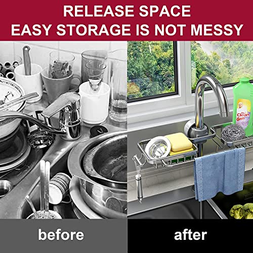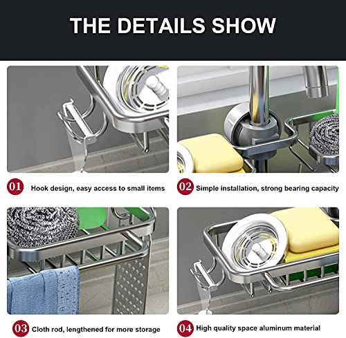 - 🧼【PREMIUM MATERIALS】The sink sponge holder is made of high-quality aluminium steel and ABS.The holder is made of solid space aluminum; the cap is made of sturdy plastic.Also, its load-bearing capacity is very good, you don't have to worry about the sink caddy organizer deforming after a short period of use.