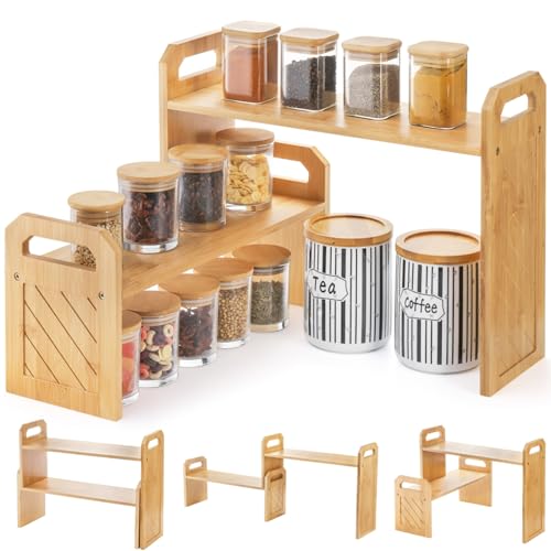 Noamus - Kitchen Countertop Organizer Corner Shelf, 3-Tier Bamboo Counter Organizer, Adjustable Bathroom Storage Display Shelves, Space Saving Spice Rack for Kitchen, Dresser, Coffee Bar, Over Sink