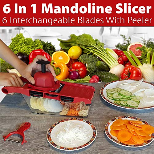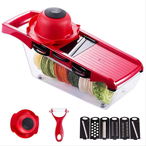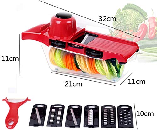 - ❤6 INTERCHANGABLE BLADES: Vegetable slicer has 6pcs stainless steel blades: 1.5mm & 2.5mm slicer, 3.0mm & 4.0mm julienne blade, grater and wavy slicer, and a bonus a peeler. One slicer meet all your daily needs