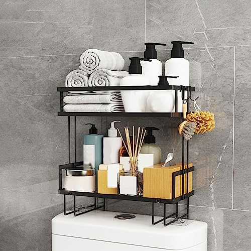Nofaner - Over The Toilet Storage, 2-Tier Bathroom Organizer Shelves, Multifunctional Over Toilet Bathroom Organizer, No Assembly Bathroom Organizer Shelf, Folding Over Toilet Storage with Hooks (Black)