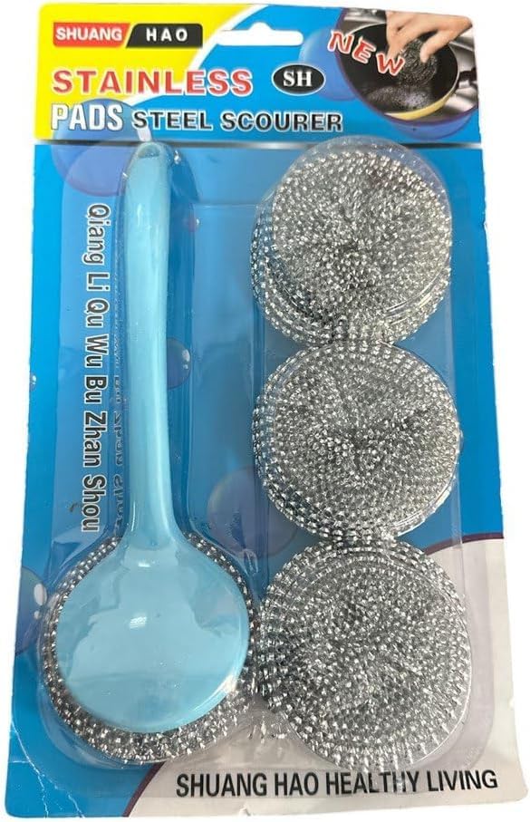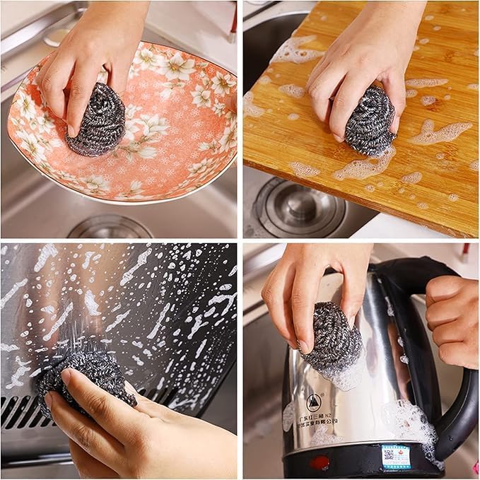 - If you want to clean the stove or pot bottle, you can wet the steel washing ball, then add some detergent, to clean the rusty place repeatedly. The cleaning tool can help you clean the kitchen pot, pan, etc, widely used in daily use. EASY TO USE: Perfect for use on ovens, grills, pots, pans, outdoor furniture, tools and more. Easily removes stubborn grease and dirt. And easy to clean. Soft and stretchy. A good helper for your unique kitchen. What You Get: 1pc long handle + 4pcs Stainless Steel Sponge