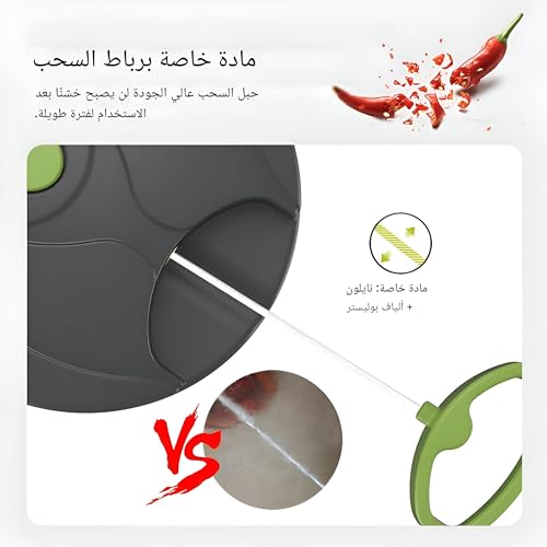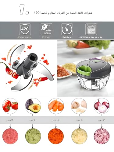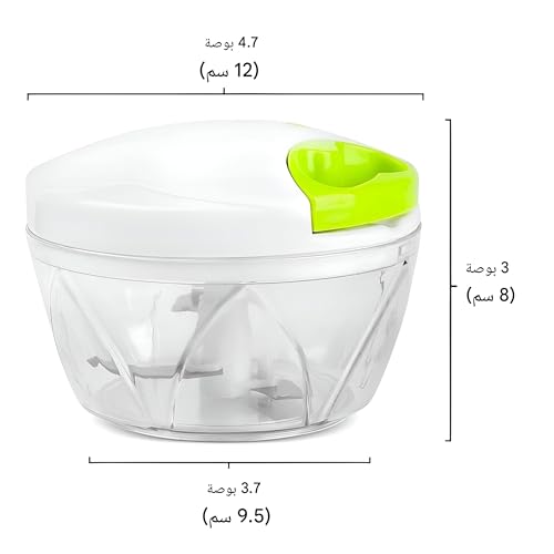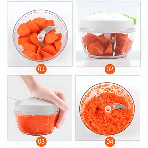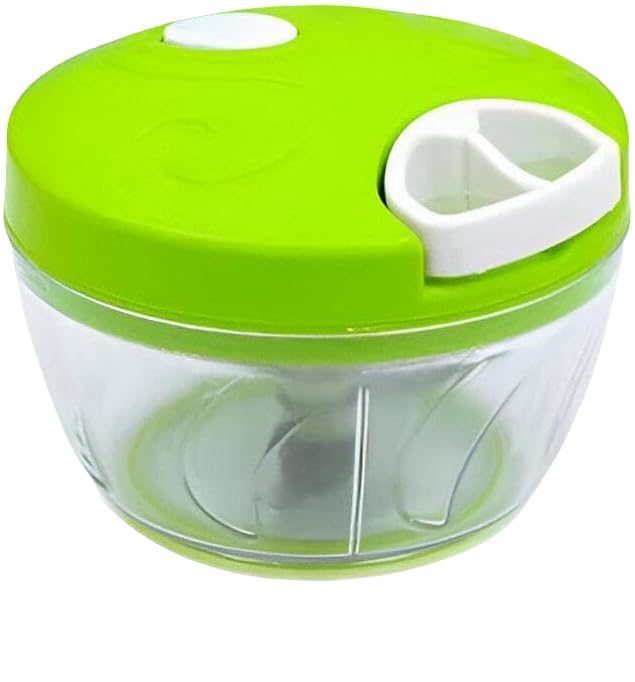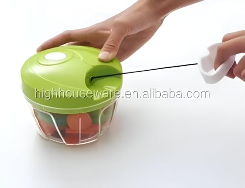 - Compact handheld food chopper with a 500 ml capacity and compact dimensions (about 9 x 8.5 x 12.5 cm), designed for chopping and stirring without electricity. It features three quick-pull segments for easy operation, a non-slip base for stability, and three removable sharp curved stainless steel blades. The pull cord with a spring mechanism powers fast blade rotation when you pull. Made from food-grade , safe, non-toxic, and durable, with all parts removable and washable by water, ideal for sma