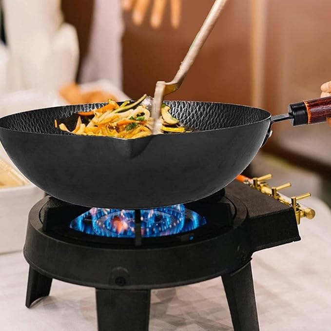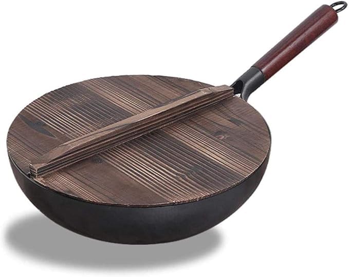 Generic - مقلاة ووك غير لاصقة شديدة التحمل من الحديد مع غطاء خشبي للموقد الكهربائي العلوي