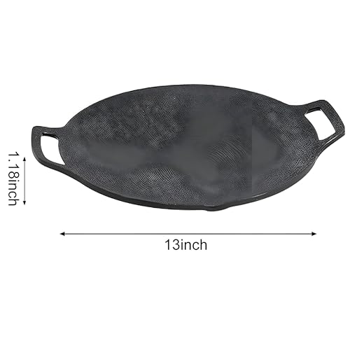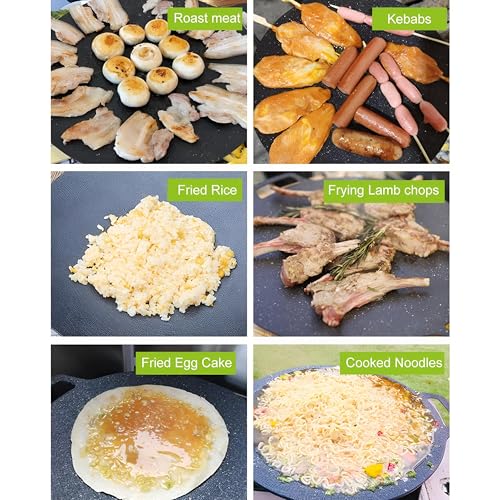 - MAKE ALL TYPES OF FOOD: 34cm/13" aluminum alloy frying pan. You can make all types of grilling, like bacon, pancakes, fried rice cakes, ribs, fried meats, etc. Can be well compatible with many fireplaces